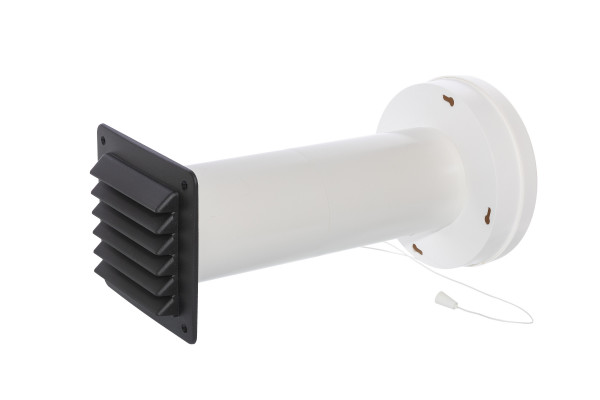 Wanddurchführungssatz komplett, Innenseite verschließbar mittels einer Kordel; offen/geschlossen. Der Luftstrom wird rundum verteilt, dadurch keine Zugluft.
