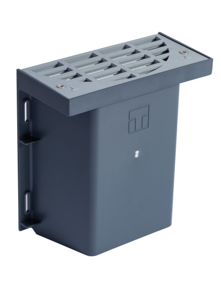 Der T174-B Lüftungsschächt kann mit einem Kunststoff-, Edelstahl-, schwarz- oder CorTen-Stahlgitter geliefert werden. Die Befestigung erfolgt durch vier Aufhängepunkte. Die Unterseite des Lüftungsschächts ist teilweise offen, sodass eventuell Regenwasser an der Vorderseite der Mauer bleibt. Das Gitter wird mit zwei mitgelieferten Schrauben befestigt.