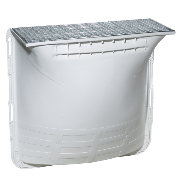 Starke, formstabile, wetterfeste Keller-Lichtschacht aus Polypropylen. Standardmäßig wird der Keller-Lichtschacht, auch Koekoek oder Wolfskuil genannt, mit einem ansprechenden, begehbaren Gitterrost (30x10mm) und Befestigungsmaterialien geliefert. Die Keller-Lichtschächte sind universell einsetzbar. Die sehr hohe Reflexionskapazität des Lichtschachts durch eine sehr glatte, weiße Oberfläche sorgt für einen optimalen Lichteinfall im Keller.