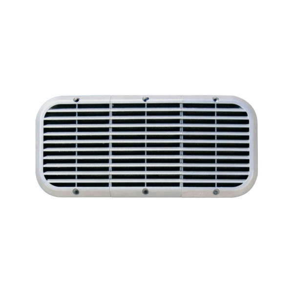 Ausführung rechteckig, mit Insektengitter, standardmäßig in blankem Aluminium. Das Gitter ist einfach zu entfernen.